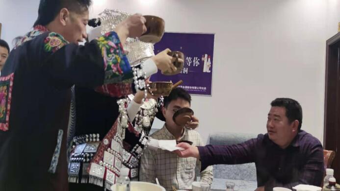 当客人在喝碗中酒的时候,多名苗家姑娘分站在客人两侧,分别将酒罐呈阶梯状往客人酒 碗里加酒,这样就像高山上流下泉水一样,就会有源源不断喝不完甘甜的米酒流进客人的口里。 并有苗族传统乐器伴奏,表现传统苗族人家对远道而来的客人的热烈欢迎。